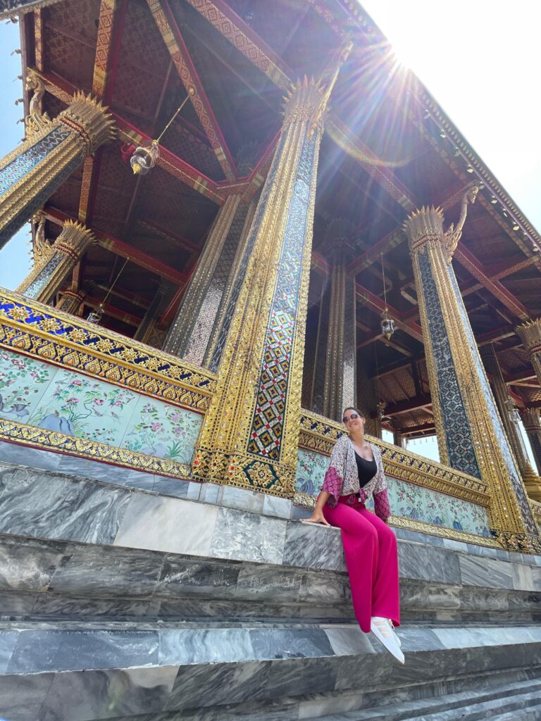 Un día entero lo dedicamos a ver los templos de Bangkok. Primera aclaración: el código de vestimenta de los templos requiere que se cubran los hombros, el escote y las rodillas en ambos sexos. Esto es muy importante para que te dejen entrar, aunque también recomiendo que sea ropa liviana y suelta por el calor que suele hacer.