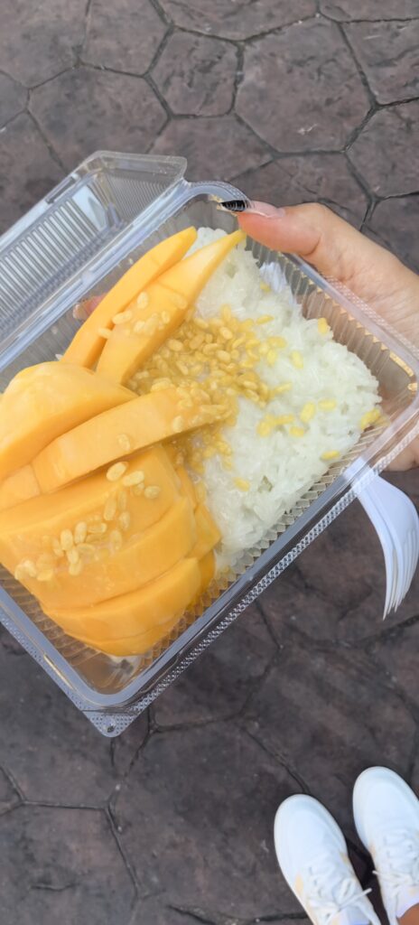 Ah y palabras aparte para todo lo que incluya mango. Simplemente EXQUISITO; desde el mango sticky rice (un postre con mango, arroz y leche de coco), hasta licuados, roti/panqueques o simplemente cortado en el momento y adentro de una bolsa en un puesto de la calle. Como todo turista, primero tenés miedo de que la comida de la calle te haga mal o esté en mal estado, pero en Tailandia esto no aplica. Las mejores comidas son ahí o en los mercados, y encima desde unos 30THB en adelante cada plato. Lo que no probé por miedo fueron los insectos. Constantemente te vienen a ofrecer en la calle arañas, escorpiones, gusanos, etc. disecados. Pero nunca vi a nadie comprar, jaja. También antes de ir había visto sobre los supermercados 7Eleven. A mí me encantaron. Tienen muchas opciones de comida lista rica y compramos varias veces volviendo de fiesta.