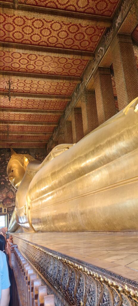 De ahí nos tomamos un tuk tuk, que también es una atracción en sí misma. Son los “taxis” tailandeses abiertos y aunque cuesten más caros que los verdaderos (ahora debido a su popularidad turística), igual creo yo que vale la pena hacer un trayecto en ellos. Vale regatear en esto, así como en otras cosas que necesites comprar en la calle. Con él nos fuimos a Wat Pho (dato; Wat significa templo). Es también conocido como el templo del Buda Reclinado. La entrada salió 300THB. Especialmente en éste, los jardines son muy bonitos y me llamaron la atención los salones con cientos de budas uno al lado del otro, con diferentes posiciones de manos y brazos. Hay algunos pocos carteles que explican, pero si alguien quiere interiorizarse más es mejor hacerlo con guía.