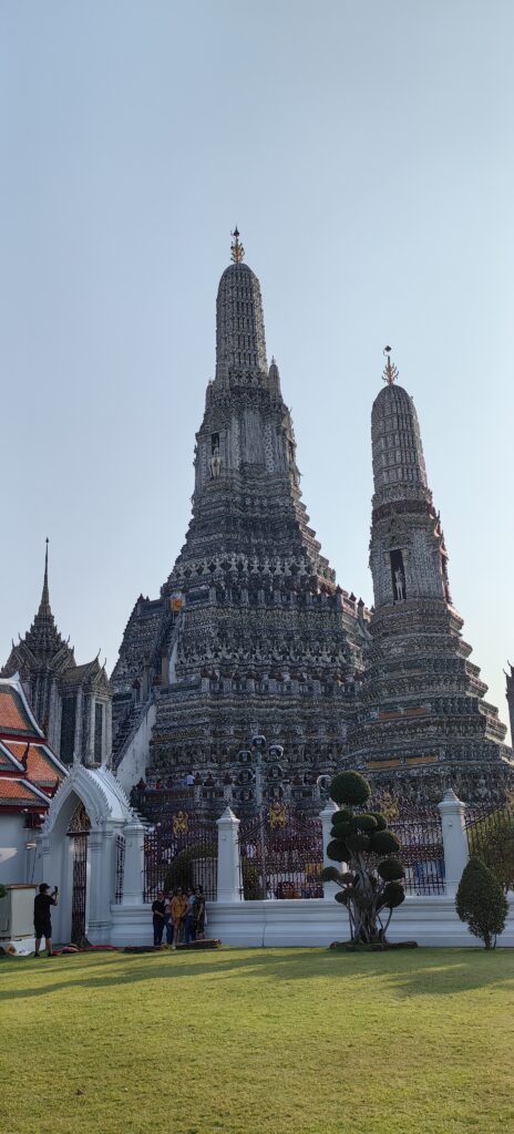 Nos fuimos a almorzar enfrente a Home Cafe Tha Tian donde comimos muy rico pollo frito Thai con arroz y disfrutamos un poco del aire acondicionado. De allí cruzamos en bote el río Chao Phraya desde la estación Tah Tian hasta Wat Arun, para visitar el templo del mismo nombre. El bote nos costó 5THB por tramo por persona y la entrada a este templo otros 300THB.